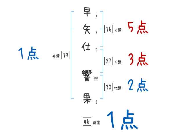 総運![]() | 早矢仕響果さんの総運は46画の1つ星!迷走することが多く苦労するかも。目先のことにとらわれないように。 あなたの人生を表す1番重要な運勢です。生涯を通じて影響する総合運となり、主に50歳以降の晩年期に影響を及ぼします。 |