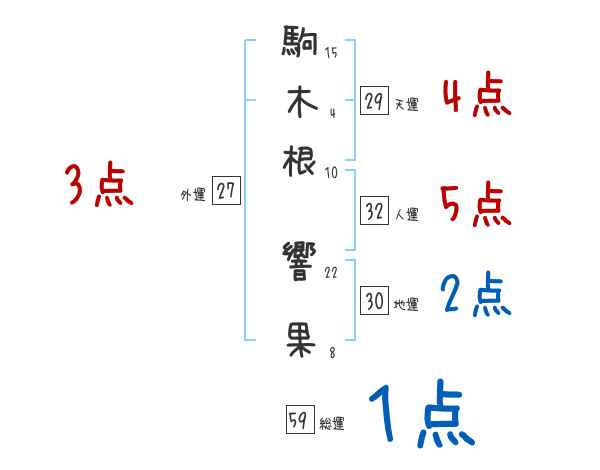 人運![]() | 駒木根響果さんの人運は32画の5つ星!柔軟性があり成功する。チャンスが多く金運が良い。 性格や才能などを表す2番目に重要な運勢です。人間関係や協調性、社会的な成功に影響します。主に20歳から50歳ぐらいまでの中年期の運勢を表します。 |