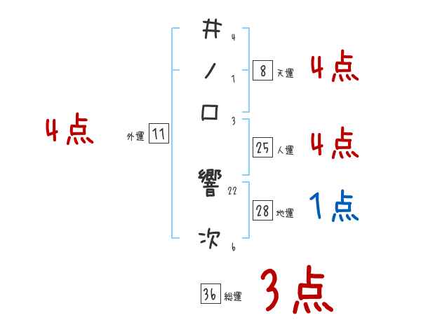 総運![]() | 井ノ口響次さんの総運は36画の3つ星!先見性が豊かです。多少神経質で苦労することも。 あなたの人生を表す1番重要な運勢です。生涯を通じて影響する総合運となり、主に50歳以降の晩年期に影響を及ぼします。 |