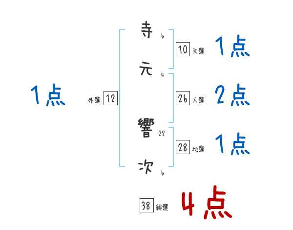 天運![]() | 寺元響次さんの天運は10画の1つ星!不安を感じやすい傾向。ストレスを抱えないように注意しましょう。 家系が持つ宿命的な運勢を表します。祖先から受け継いだ苗字ですので自分の力が及びません。家柄を象徴します。 |