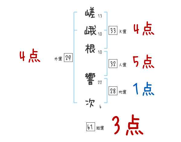 人運![]() | 嵯峨根響次さんの人運は32画の5つ星!柔軟性があり成功する。チャンスが多く金運が良い。 性格や才能などを表す2番目に重要な運勢です。人間関係や協調性、社会的な成功に影響します。主に20歳から50歳ぐらいまでの中年期の運勢を表します。 |