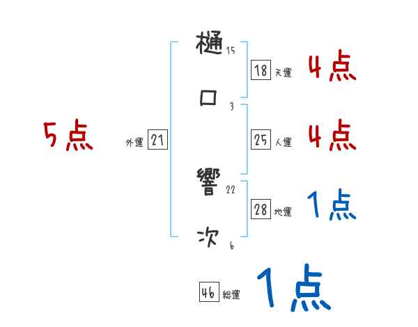 総運![]() | 樋口響次さんの総運は46画の1つ星!迷走することが多く苦労するかも。目先のことにとらわれないように。 あなたの人生を表す1番重要な運勢です。生涯を通じて影響する総合運となり、主に50歳以降の晩年期に影響を及ぼします。 |