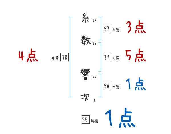 外運![]() | 糸数響次さんの外運は18画の4つ星!情熱的で剛気。忍耐力があり信頼される。 生活面を象徴する運勢です。外部から受ける影響力を表し、結婚運、家庭運や職場、環境への順応性を表します。 |
