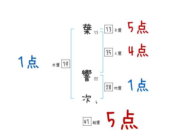 地運![]() | 葉響次さんの地運は28画の1つ星!家庭環境に注意。スポーツで活躍できる能力があるかも。 個性を表す基礎的な運勢です。性格形成や対人関係、行動力など家庭環境に影響されます。主に誕生してから20歳くらいまでの若年期の運勢を表します。 |