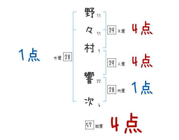 天運![]() | 野々村響次さんの天運は29画の4つ星!完全主義で才能がある。厳格な心の持ち主。 家系が持つ宿命的な運勢を表します。祖先から受け継いだ苗字ですので自分の力が及びません。家柄を象徴します。 |