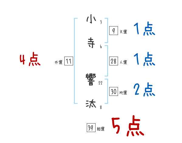 総運![]() | 小寺響汰さんの総運は39画の5つ星!社交性に優れ人望が厚い。人の上に立ち成功する。 あなたの人生を表す1番重要な運勢です。生涯を通じて影響する総合運となり、主に50歳以降の晩年期に影響を及ぼします。 |