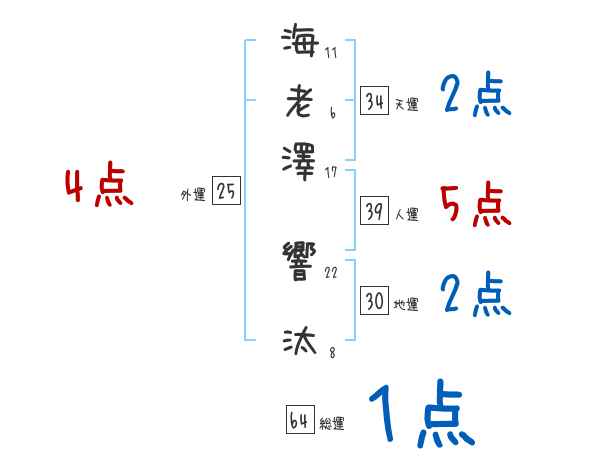 天運![]() | 海老澤響汰さんの天運は34画の2つ星!独創性に優れるが、自尊心が強く災難に注意しましょう。 家系が持つ宿命的な運勢を表します。祖先から受け継いだ苗字ですので自分の力が及びません。家柄を象徴します。 |