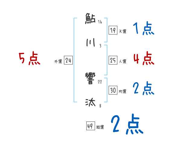外運![]() | 鮎川響汰さんの外運は24画の5つ星!家庭運が良く順調な人生。金運にも恵まれる。 生活面を象徴する運勢です。外部から受ける影響力を表し、結婚運、家庭運や職場、環境への順応性を表します。 |