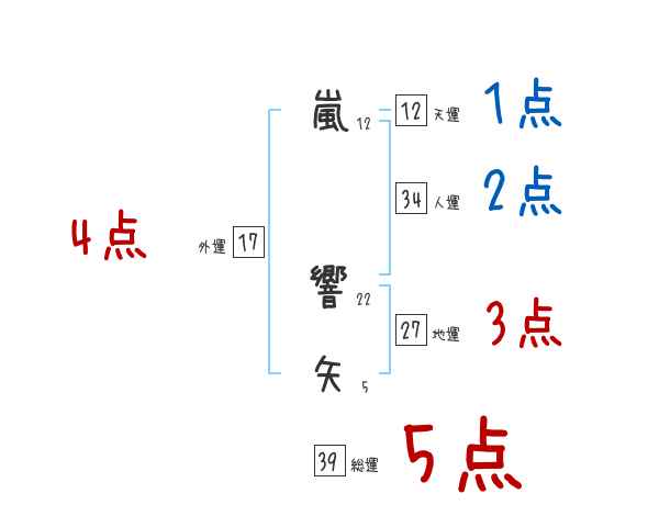 外運![]() | 嵐響矢さんの外運は17画の4つ星!積極的な行動力。地位を気づき財産を手に入れる。純粋な心と直感力。 生活面を象徴する運勢です。外部から受ける影響力を表し、結婚運、家庭運や職場、環境への順応性を表します。 |