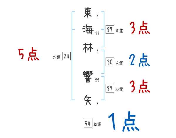総運![]() | 東海林響矢さんの総運は54画の1つ星!トラブルが多いかも。周りをよく見て協調して過ごしましょう。 あなたの人生を表す1番重要な運勢です。生涯を通じて影響する総合運となり、主に50歳以降の晩年期に影響を及ぼします。 |