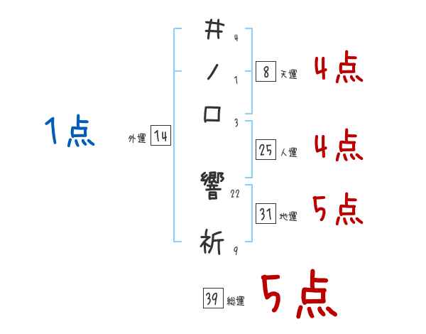 外運![]() | 井ノ口響祈さんの外運は14画の1つ星!人に対して優しいがストレスを溜め込みがち。人間関係のトラブルを避けるよう気をつけましょう。 生活面を象徴する運勢です。外部から受ける影響力を表し、結婚運、家庭運や職場、環境への順応性を表します。 |