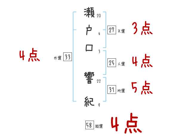 外運![]() | 瀬戸口響紀さんの外運は33画の4つ星!権力志向でプライドが高い。勇気があり運を切り開き成功する。 生活面を象徴する運勢です。外部から受ける影響力を表し、結婚運、家庭運や職場、環境への順応性を表します。 |