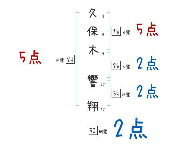 総運![]() | 久保木響翔さんの総運は50画の2つ星!浮き沈みが激しく不安定。しりすぼみに衰退しやすいので注意しましょう。 あなたの人生を表す1番重要な運勢です。生涯を通じて影響する総合運となり、主に50歳以降の晩年期に影響を及ぼします。 |