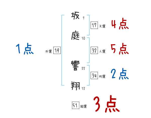 外運![]() | 坂庭響翔さんの外運は19画の1つ星!優れた才能を持ちますが、協調性が足りないことも。周りの人と協力する事を意識しましょう。 生活面を象徴する運勢です。外部から受ける影響力を表し、結婚運、家庭運や職場、環境への順応性を表します。 |