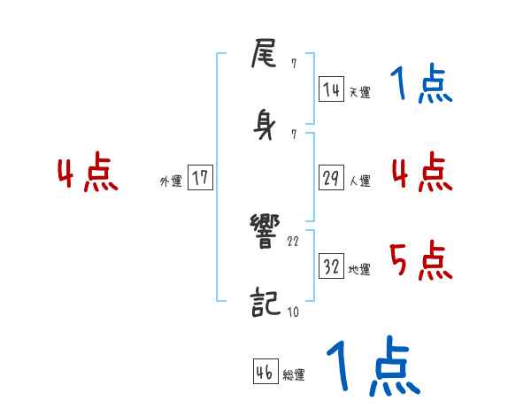天運![]() | 尾身響記さんの天運は14画の1つ星!人に対して優しいがストレスを溜め込みがち。人間関係のトラブルを避けるよう気をつけましょう。 家系が持つ宿命的な運勢を表します。祖先から受け継いだ苗字ですので自分の力が及びません。家柄を象徴します。 |