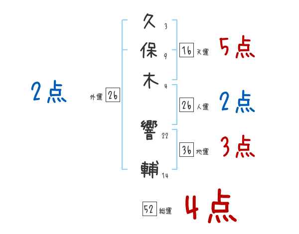 外運![]() | 久保木響輔さんの外運は26画の2つ星!波瀾万丈かも。信頼できる人を大事にしましょう。 生活面を象徴する運勢です。外部から受ける影響力を表し、結婚運、家庭運や職場、環境への順応性を表します。 |