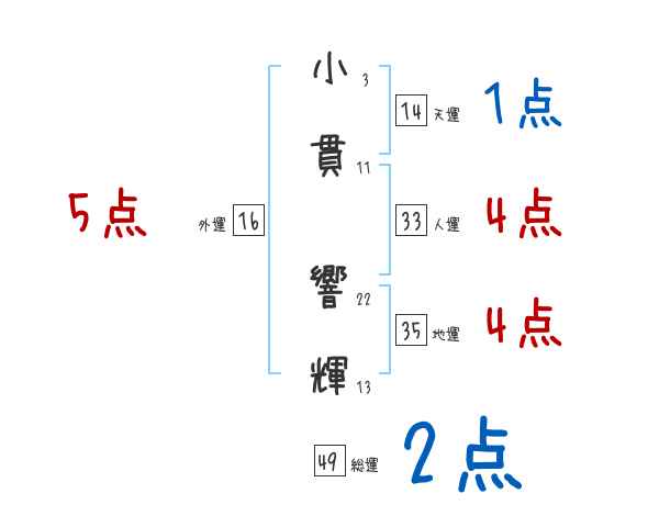 外運![]() | 小貫響輝さんの外運は16画の5つ星!人望が厚く大きく発展する。逆転成功が見える。 生活面を象徴する運勢です。外部から受ける影響力を表し、結婚運、家庭運や職場、環境への順応性を表します。 |