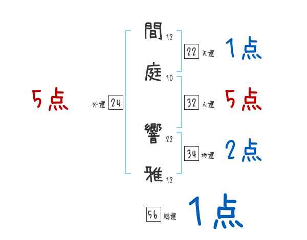 人運![]() | 間庭響雅さんの人運は32画の5つ星!柔軟性があり成功する。チャンスが多く金運が良い。 性格や才能などを表す2番目に重要な運勢です。人間関係や協調性、社会的な成功に影響します。主に20歳から50歳ぐらいまでの中年期の運勢を表します。 |