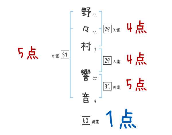 地運![]() | 野々村響音さんの地運は31画の5つ星!社交性があり判断力に優れる。順風満帆な人生で円満な生活。 個性を表す基礎的な運勢です。性格形成や対人関係、行動力など家庭環境に影響されます。主に誕生してから20歳くらいまでの若年期の運勢を表します。 |