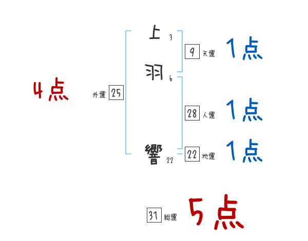 天運![]() | 上羽響さんの天運は9画の1つ星!消極的で才能を発揮することが苦手なことも。周りの意見に耳を傾けましょう。 家系が持つ宿命的な運勢を表します。祖先から受け継いだ苗字ですので自分の力が及びません。家柄を象徴します。 |