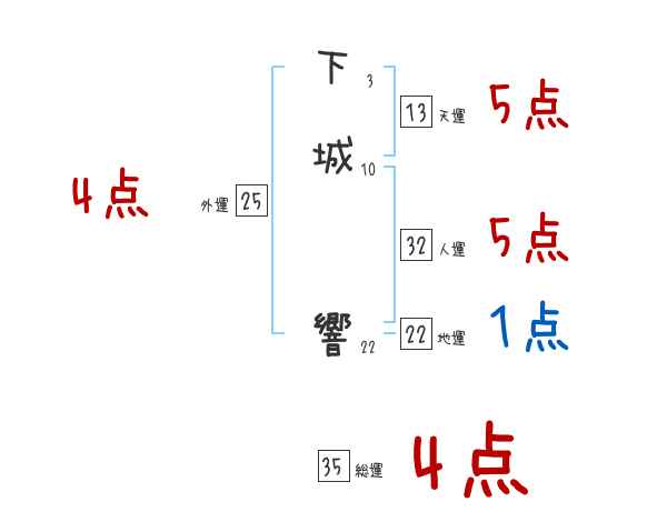 天運![]() | 下城響さんの天運は13画の5つ星!才能に恵まれ人気がある。名声を手に入れる。円満な人生。 家系が持つ宿命的な運勢を表します。祖先から受け継いだ苗字ですので自分の力が及びません。家柄を象徴します。 |