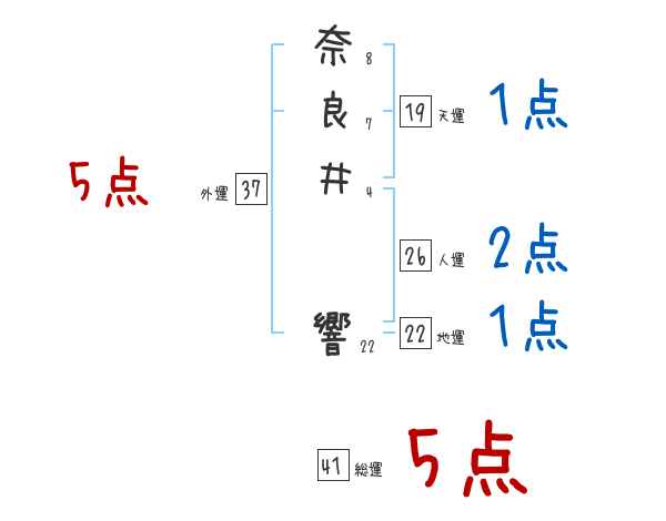 総運![]() | 奈良井響さんの総運は41画の5つ星!大志を抱き、目標に向かって実力を発揮し達成する。温和な性格。 あなたの人生を表す1番重要な運勢です。生涯を通じて影響する総合運となり、主に50歳以降の晩年期に影響を及ぼします。 |