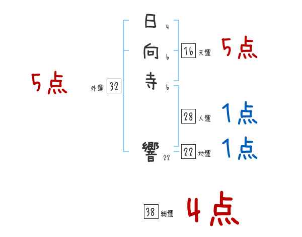 天運![]() | 日向寺響さんの天運は16画の5つ星!人望が厚く大きく発展する。逆転成功が見える。 家系が持つ宿命的な運勢を表します。祖先から受け継いだ苗字ですので自分の力が及びません。家柄を象徴します。 |