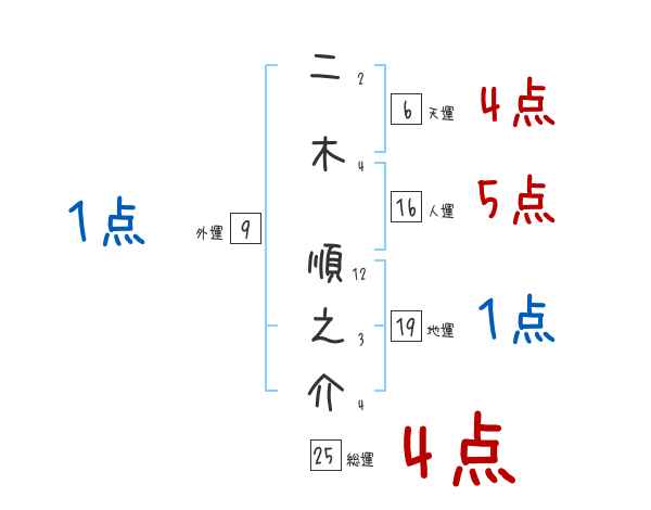 外運![]() | 二木順之介さんの外運は9画の1つ星!消極的で才能を発揮することが苦手なことも。周りの意見に耳を傾けましょう。 生活面を象徴する運勢です。外部から受ける影響力を表し、結婚運、家庭運や職場、環境への順応性を表します。 |