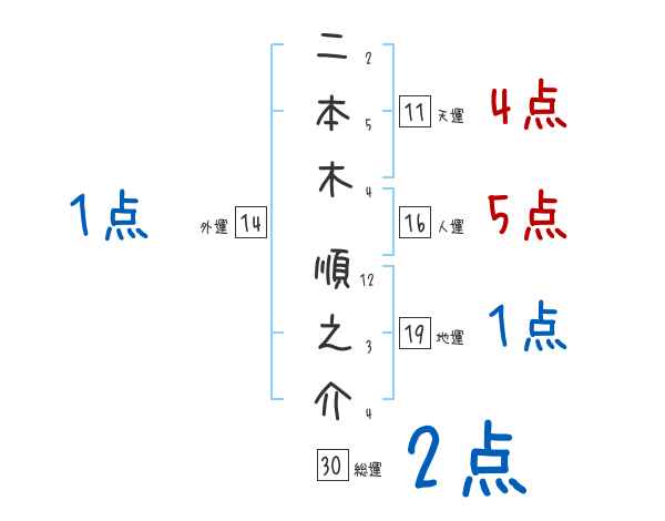 人運![]() | 二本木順之介さんの人運は16画の5つ星!人望が厚く大きく発展する。逆転成功が見える。 性格や才能などを表す2番目に重要な運勢です。人間関係や協調性、社会的な成功に影響します。主に20歳から50歳ぐらいまでの中年期の運勢を表します。 |