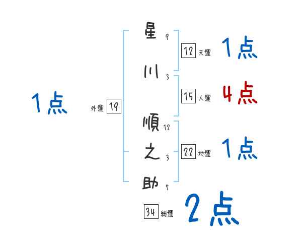 総運![]() | 星川順之助さんの総運は34画の2つ星!独創性に優れるが、自尊心が強く災難に注意しましょう。 あなたの人生を表す1番重要な運勢です。生涯を通じて影響する総合運となり、主に50歳以降の晩年期に影響を及ぼします。 |