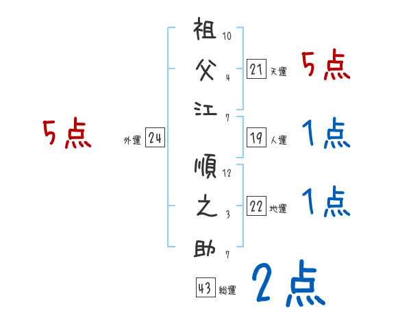 天運![]() | 祖父江順之助さんの天運は21画の5つ星!統率力がある。独立し成功する。名誉を手に入れる。 家系が持つ宿命的な運勢を表します。祖先から受け継いだ苗字ですので自分の力が及びません。家柄を象徴します。 |