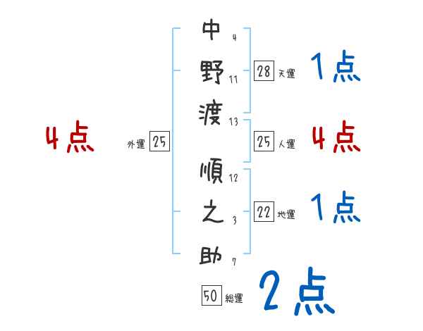 天運![]() | 中野渡順之助さんの天運は28画の1つ星!家庭環境に注意。スポーツで活躍できる能力があるかも。 家系が持つ宿命的な運勢を表します。祖先から受け継いだ苗字ですので自分の力が及びません。家柄を象徴します。 |