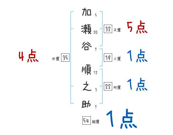 外運![]() | 加瀬谷順之助さんの外運は35画の4つ星!温厚な性格で感受性が高い。穏和な性格で人望が厚い。 生活面を象徴する運勢です。外部から受ける影響力を表し、結婚運、家庭運や職場、環境への順応性を表します。 |