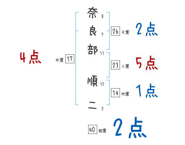 外運![]() | 奈良部順二さんの外運は17画の4つ星!積極的な行動力。地位を気づき財産を手に入れる。純粋な心と直感力。 生活面を象徴する運勢です。外部から受ける影響力を表し、結婚運、家庭運や職場、環境への順応性を表します。 |