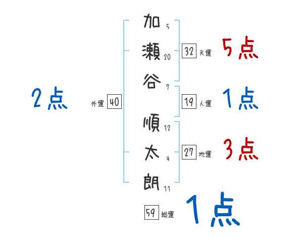 天運![]() | 加瀬谷順太朗さんの天運は32画の5つ星!柔軟性があり成功する。チャンスが多く金運が良い。 家系が持つ宿命的な運勢を表します。祖先から受け継いだ苗字ですので自分の力が及びません。家柄を象徴します。 |