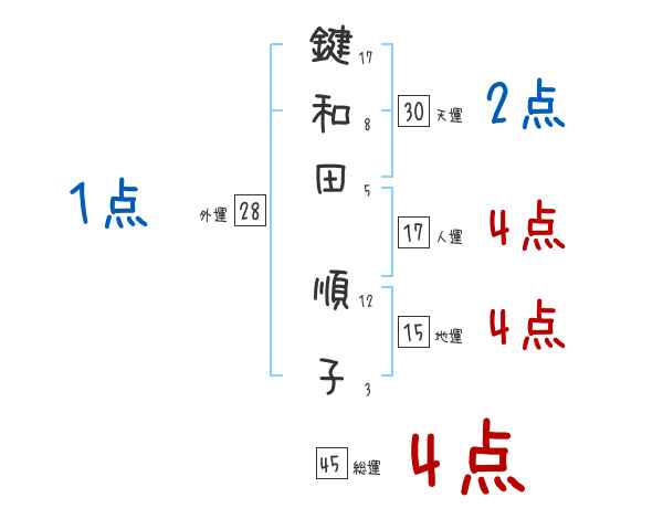天運![]() | 鍵和田順子さんの天運は30画の2つ星!浮き沈みの激しさに注意しましょう。 家系が持つ宿命的な運勢を表します。祖先から受け継いだ苗字ですので自分の力が及びません。家柄を象徴します。 |