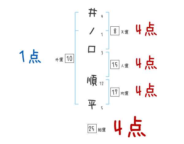 天運![]() | 井ノ口順平さんの天運は8画の4つ星!勤勉家。根気強く努力し成功する。忍耐力がある。 家系が持つ宿命的な運勢を表します。祖先から受け継いだ苗字ですので自分の力が及びません。家柄を象徴します。 |