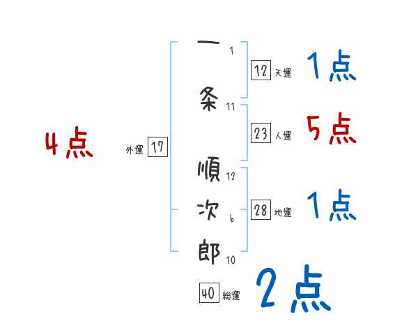 人運![]() | 一条順次郎さんの人運は23画の5つ星!想像力に優れ活力がある。一代で成功し名誉を手に入れる。 性格や才能などを表す2番目に重要な運勢です。人間関係や協調性、社会的な成功に影響します。主に20歳から50歳ぐらいまでの中年期の運勢を表します。 |