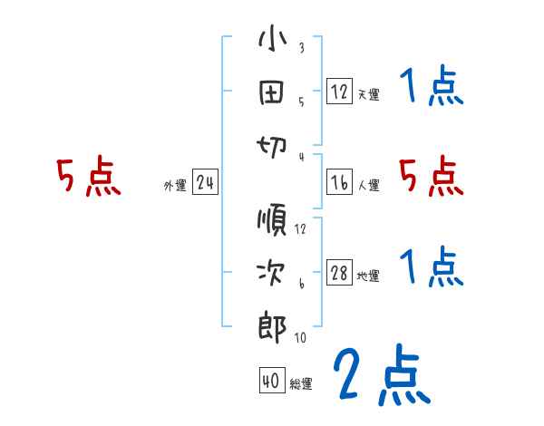 人運![]() | 小田切順次郎さんの人運は16画の5つ星!人望が厚く大きく発展する。逆転成功が見える。 性格や才能などを表す2番目に重要な運勢です。人間関係や協調性、社会的な成功に影響します。主に20歳から50歳ぐらいまでの中年期の運勢を表します。 |