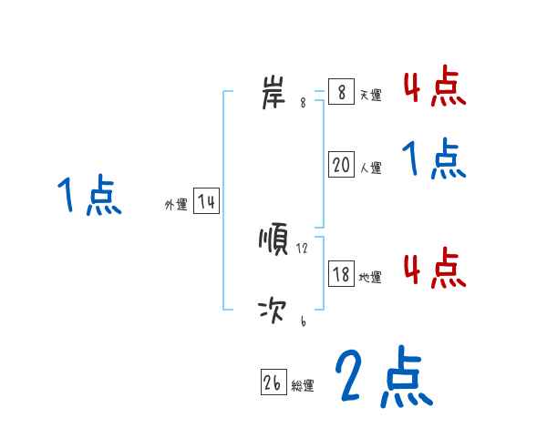 天運![]() | 岸順次さんの天運は8画の4つ星!勤勉家。根気強く努力し成功する。忍耐力がある。 家系が持つ宿命的な運勢を表します。祖先から受け継いだ苗字ですので自分の力が及びません。家柄を象徴します。 |