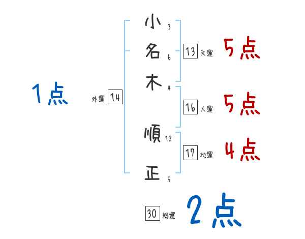 人運![]() | 小名木順正さんの人運は16画の5つ星!人望が厚く大きく発展する。逆転成功が見える。 性格や才能などを表す2番目に重要な運勢です。人間関係や協調性、社会的な成功に影響します。主に20歳から50歳ぐらいまでの中年期の運勢を表します。 |