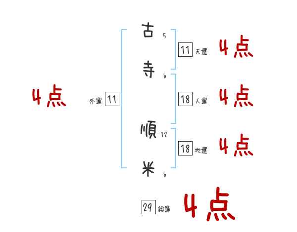 天運![]() | 古寺順米さんの天運は11画の4つ星!着実に富や地位を得る幸運な人生。 家系が持つ宿命的な運勢を表します。祖先から受け継いだ苗字ですので自分の力が及びません。家柄を象徴します。 |