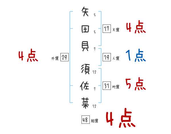 外運![]() | 矢田貝須佐菜さんの外運は29画の4つ星!完全主義で才能がある。厳格な心の持ち主。 生活面を象徴する運勢です。外部から受ける影響力を表し、結婚運、家庭運や職場、環境への順応性を表します。 |
