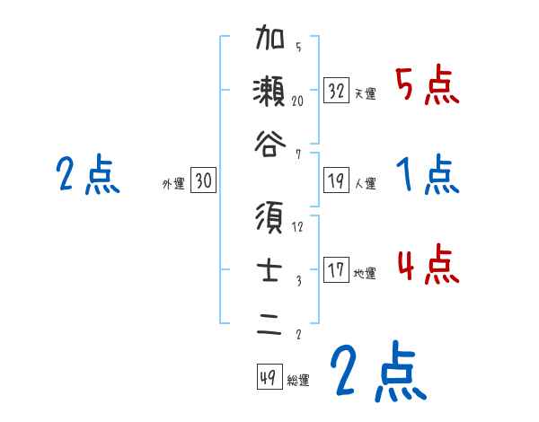 天運![]() | 加瀬谷須士二さんの天運は32画の5つ星!柔軟性があり成功する。チャンスが多く金運が良い。 家系が持つ宿命的な運勢を表します。祖先から受け継いだ苗字ですので自分の力が及びません。家柄を象徴します。 |