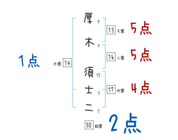 人運![]() | 厚木須士二さんの人運は16画の5つ星!人望が厚く大きく発展する。逆転成功が見える。 性格や才能などを表す2番目に重要な運勢です。人間関係や協調性、社会的な成功に影響します。主に20歳から50歳ぐらいまでの中年期の運勢を表します。 |