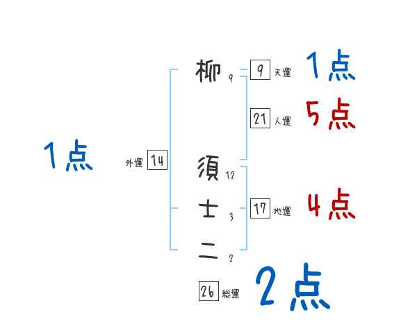 外運![]() | 柳須士二さんの外運は14画の1つ星!人に対して優しいがストレスを溜め込みがち。人間関係のトラブルを避けるよう気をつけましょう。 生活面を象徴する運勢です。外部から受ける影響力を表し、結婚運、家庭運や職場、環境への順応性を表します。 |