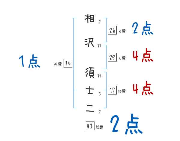 外運![]() | 相沢須士二さんの外運は14画の1つ星!人に対して優しいがストレスを溜め込みがち。人間関係のトラブルを避けるよう気をつけましょう。 生活面を象徴する運勢です。外部から受ける影響力を表し、結婚運、家庭運や職場、環境への順応性を表します。 |