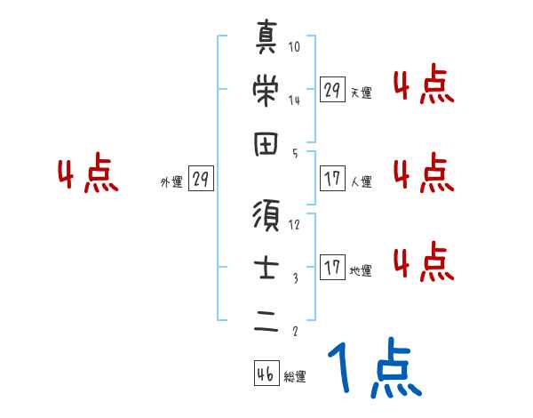 天運![]() | 真栄田須士二さんの天運は29画の4つ星!完全主義で才能がある。厳格な心の持ち主。 家系が持つ宿命的な運勢を表します。祖先から受け継いだ苗字ですので自分の力が及びません。家柄を象徴します。 |