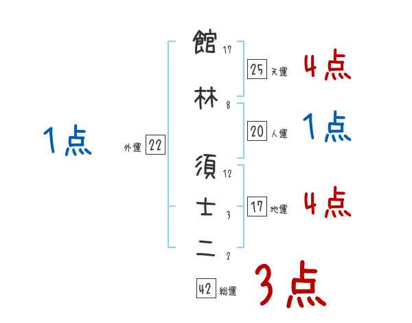 外運![]() | 館林須士二さんの外運は22画の1つ星!努力することが苦手ないっぽう手先が器用。芸術性にも優れる。 生活面を象徴する運勢です。外部から受ける影響力を表し、結婚運、家庭運や職場、環境への順応性を表します。 |