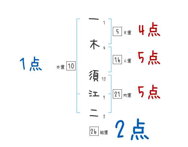 人運![]() | 一木須江二さんの人運は16画の5つ星!人望が厚く大きく発展する。逆転成功が見える。 性格や才能などを表す2番目に重要な運勢です。人間関係や協調性、社会的な成功に影響します。主に20歳から50歳ぐらいまでの中年期の運勢を表します。 |